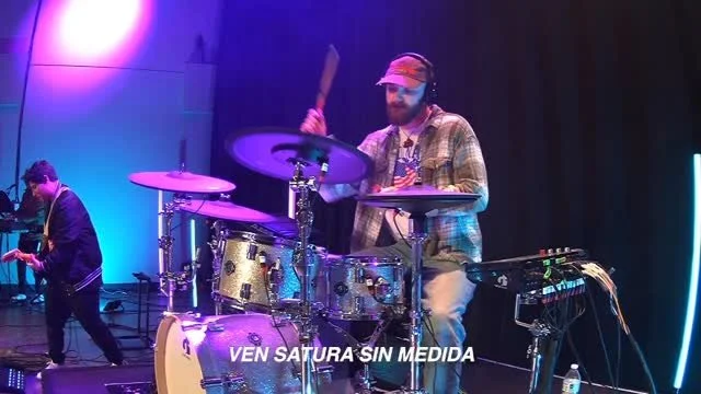 An indoor concert stage with a band performing under purple and blue lights while an audience watches. Large screens display the text '10' and other graphics.